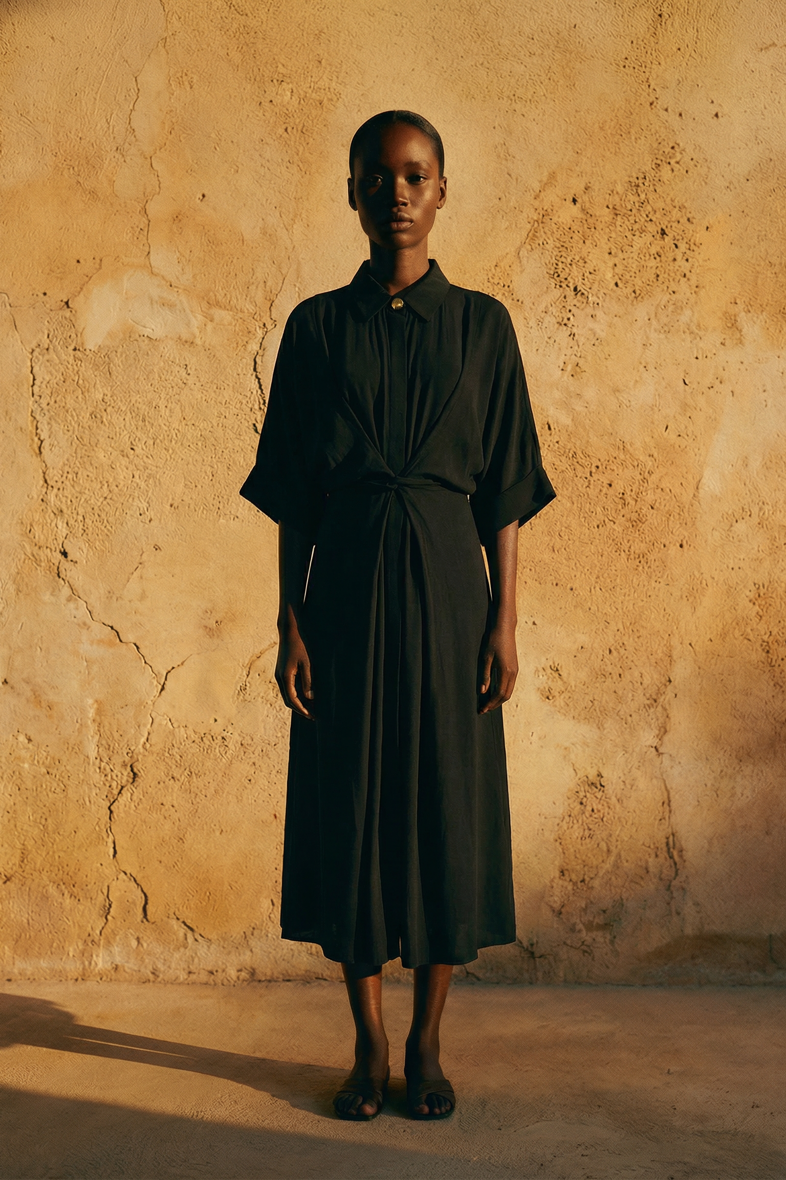 Long kimono dress. Features shirt collar with a statement gold button. Stylish wide sleeves with cuff. Hidden side seam pocket on each side. Centre front concealed button placket. Adjust to fit with two removable spaghetti tie belts, or wear it open as a flowing cover-up. Strikes the perfect balance between relaxed comfort and refined sophistication. Midi length. Black fabric in crepe viscose